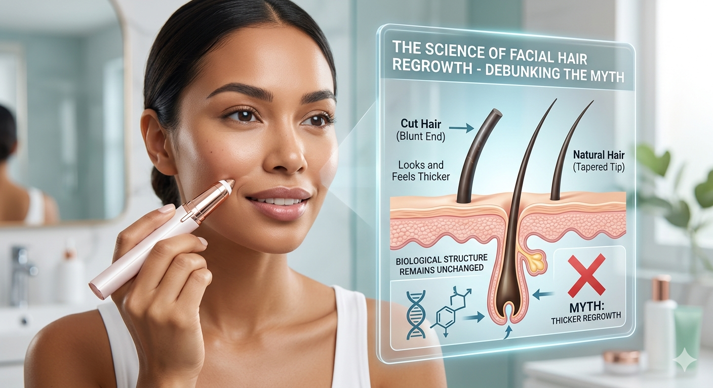 Le rasage en surface élimine uniquement les poils à la surface de la peau, créant une pointe émoussée temporaire qui semble raide à mesure qu'elle repousse. C’est la méthode la plus courante qui alimente le mythe des « cheveux plus épais ». Parce que dermaplanage exfolie également la couche supérieure des cellules mortes de la peau, la nouvelle repousse des poils se juxtapose à une peau très lisse, la rendant plus visible au toucher. En réalité, le cheveux terminaux or cheveux velus (duvet de pêche) reste biologiquement inchangé.